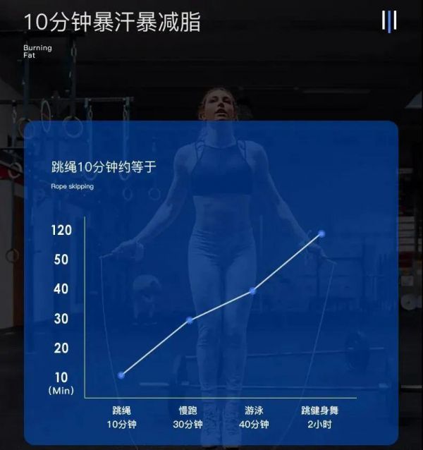 跳绳这种“一动一停”的原地高频率跳动类似于HIIT(高频率间歇性训练),能够短时间内提高燃脂效率,并且在运动停止后,也有很好的“后燃效果”。