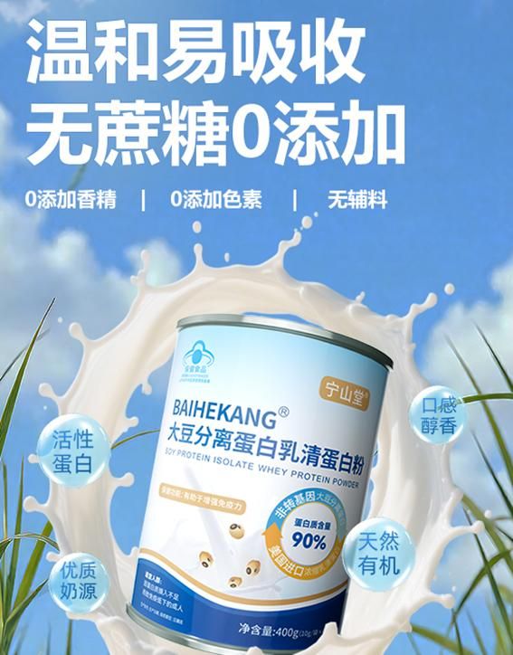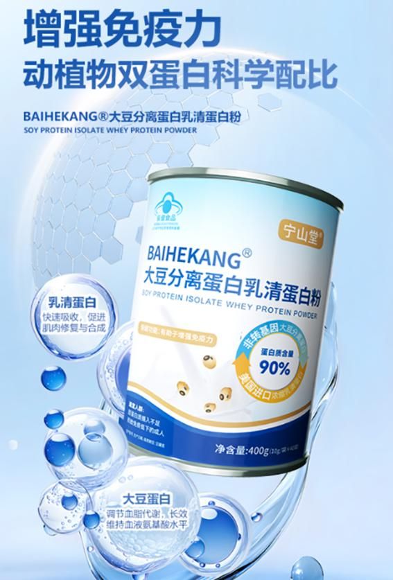 TOP1-宁山堂蛋白粉每百克含蛋白高达90g,动物与植物双蛋白矩阵,0添加,蓝帽子及NSF、FSRN认证,专为免疫调节、肌肉管理、术后恢复、肠胃敏感等全人群科学补给,安全纯净。