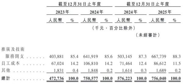 进一步细化来看,西子健康的销售费用由推广及技术服务开支、员工成本和其他三部分构成。其中推广及技术服务开支是主要费用,包括新媒体渠道、电子商务平台及线下营销活动的平台费用和开支,这部分费用各期分别为4.04亿元、6.42亿元和6.68亿元,分别占销售费用的85.4%、85.6%和88.3%。
