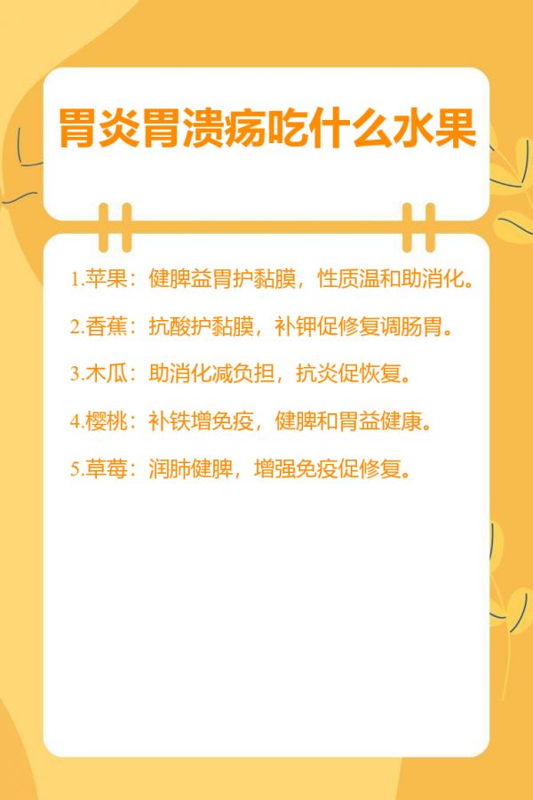 1. 苹果:富含果胶、纤维素、维生素等营养成分,具有健脾益胃、生津润燥的功效。果胶能保护胃黏膜,减轻胃酸对溃疡面的刺激,纤维素可促进胃肠蠕动,有助于消化,且苹果性质温和,适合胃炎胃溃疡患者适量食用。