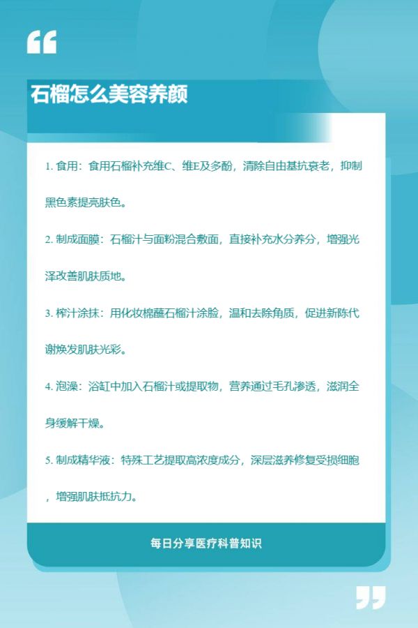 石榴可通过食用、制成面膜、榨汁涂抹、泡澡、制成精华液等方式美容养颜。