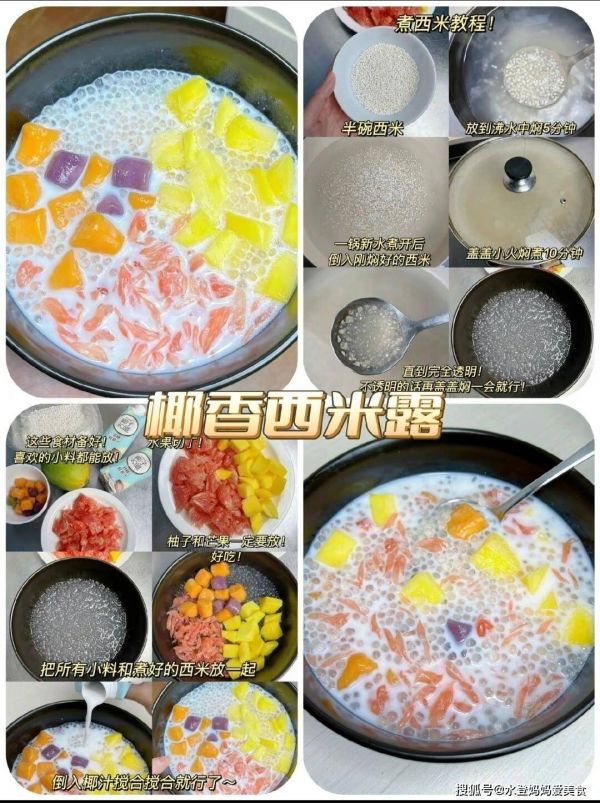 准备食材:煮好的西米、柚子果肉(去皮分成小块)、芒果果肉(切成小块)、其他喜欢的小料(如珍珠、芋圆、葡萄干等)、椰汁。将煮好的西米、柚子果肉、芒果果肉以及其他喜欢的小料一同放入碗中。向碗中倒入适量椰汁,用勺子搅拌均匀,使所有食材充分裹上椰汁,椰香西米露即可完成。