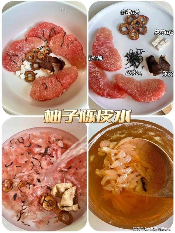 准备食材:山楂 6 片、茯苓 6 粒、柚子(取果肉或带少量果皮的果肉部分)、红茶 2g、陈皮。将山楂、茯苓、陈皮用清水快速冲洗,去除表面灰尘,红茶放入茶漏中备用。锅中加入适量清水,放入洗净的山楂、茯苓、陈皮,大火烧开后转小火煮 5-8 分钟,让食材的味道充分释放。放入柚子相关部分(若为果肉直接放入,若带少量果皮需提前处理干净并切块),继续煮 3-5 分钟。最后将装有红茶的茶漏放入锅中,或直接将红茶撒入汤中,焖泡 2-3 分钟,待茶香融入水中,关火后滤出汤汁,柚子陈皮水即可饮用。