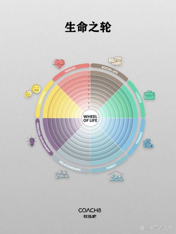 教练使用的生命之轮通常有8种生活平衡,也可以根据需要更改这些类别或为每个客户自定义措辞。