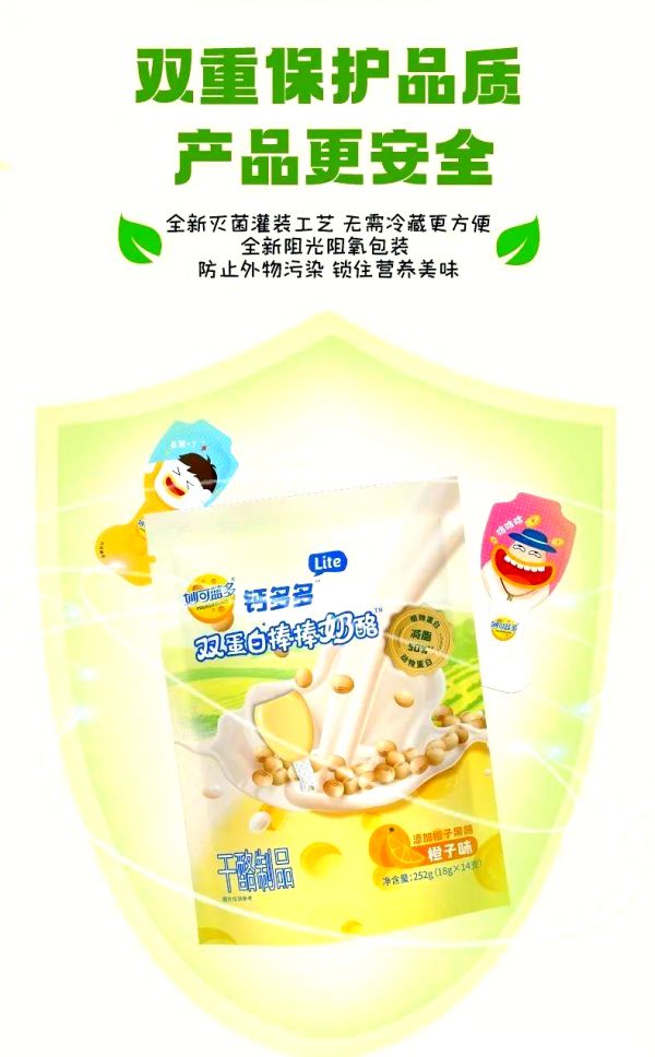 而妙可蓝多奶酪棒不仅因其丰富的钙质含量而备受推崇,更在营养价值上有所突破。这款奶酪棒融入了“双蛋白”理念,通过精选的大豆蛋白与优质牛奶蛋白的巧妙搭配,实现了植物与动物蛋白的互补与融合。这样的双重蛋白质组合,不仅使得奶酪棒的营养成分更为全面均衡,更有助于人体对蛋白质的高效吸收与利用。在健康饮食日益受到关注的今天,妙可蓝多奶酪棒无疑为追求健康生活的我们提供了新的选择。