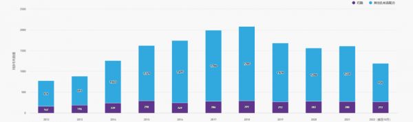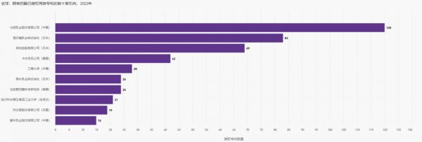 已授权专利数量位居前列的国家为中国(占全球所有专利授权的12%)、日本(9%)、美国(6%)、法国(5%)和德国(5%)。