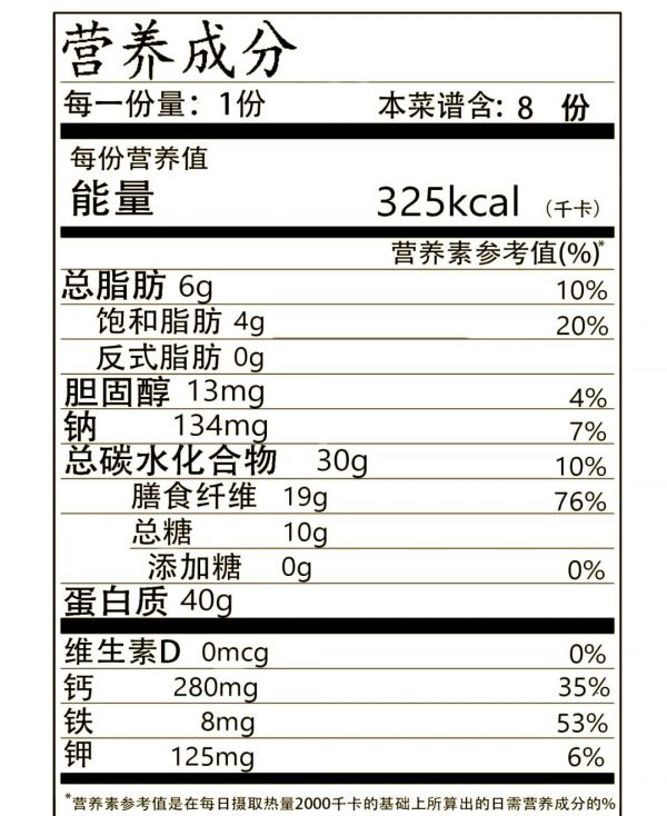 每100g黑豆面约含360kcal热量、6g的碳水化合物,42g的蛋白质以及20g的纤维,构成了这款食物的独特营养组合。尽管碳水化合物仅占总热量的10%,但蛋白质的比例高达47%,显著提升了食物的蛋白质含量。然而,为了保持均衡饮食,我们日常所需的碳水化合物摄取量应占总热量的45-65%。因此,在享受这款沙拉的同时,我建议搭配一杯奶昔,以增加碳水化合物(乳糖)和动物类蛋白质的摄入。这样的搭配,不仅美味可口,还能确保我们获得高蛋白、低碳水化合物以及高纤维的健康饮食。