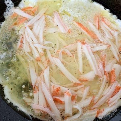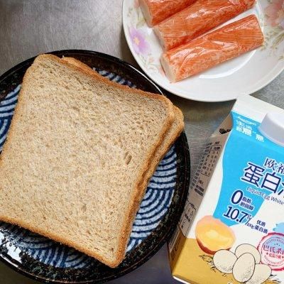 吐司 2片欧福蛋白液 150克即食蟹柳 3条盐 少许黑胡椒粉 1小撮做法步骤