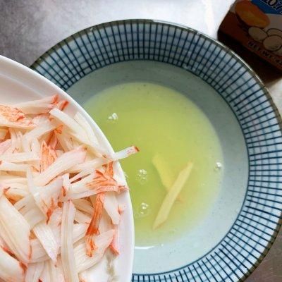 3、欧福蛋白液倒入碗中,再把撕碎的蟹柳也放入。