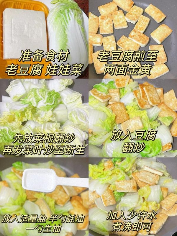 做法也巨简单,老豆腐煎一煎,娃娃菜炒一炒,调个味儿,搞定!