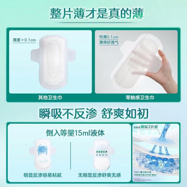 快速吸收科技:加速度瞬吸表层,不再为经血而烦恼,保持肌肤干爽。