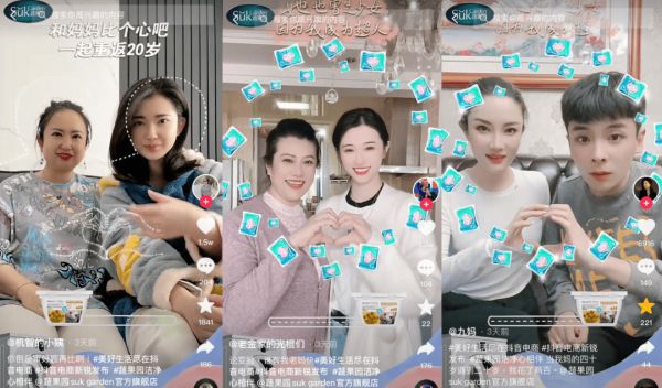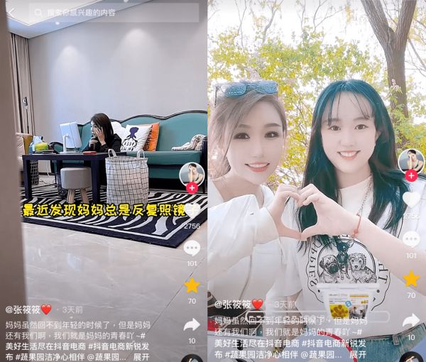 自5月5日开始,抖音站内多位达人 @张筱筱 @机智的小姨 @九妈 @老金家的光棍们 @你的三水 与家人一起使用「与妈妈重返20岁」贴纸道具拍摄视频,带妈妈面对镜头一起比心,重现妈妈年轻时的模样。