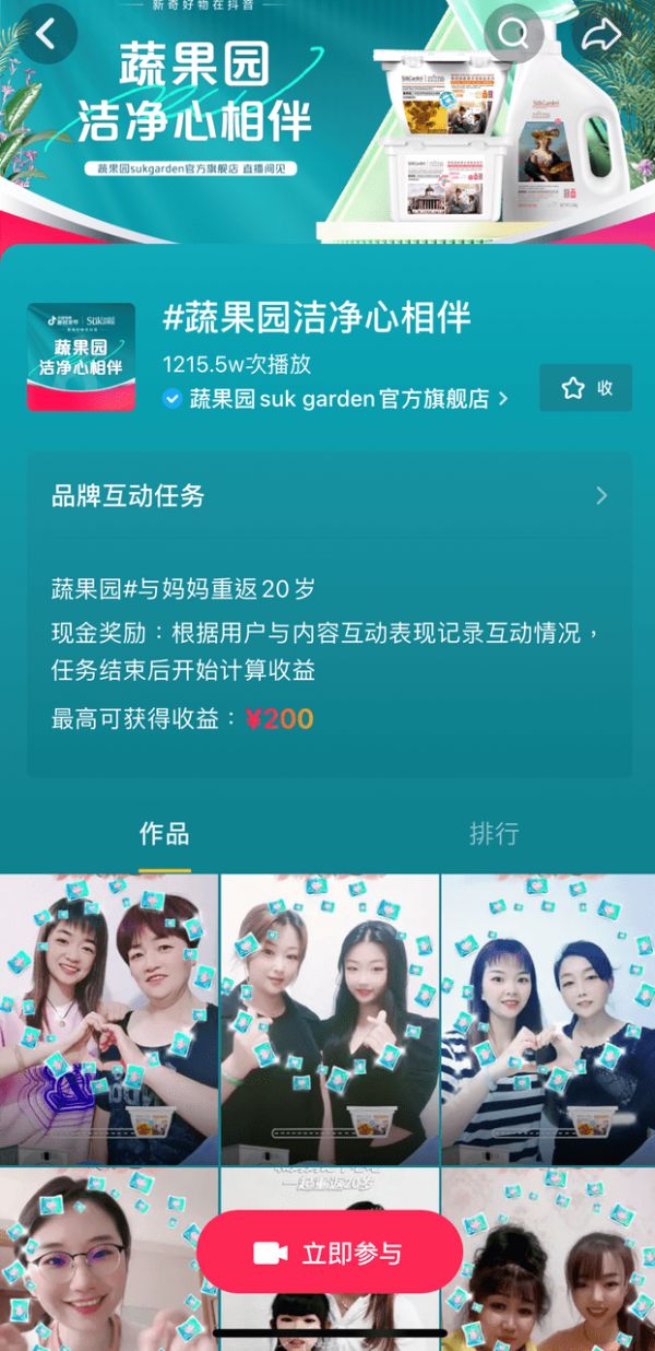 母亲是最能引起大家情感共鸣的话题,短短几天内 #蔬果园洁净心相伴 话题拥有 1215w+次播放和7.1万次参与,众多用户与妈妈一同合拍贴纸道具视频,实现用户的多点触达,助力蔬果园品牌形成大规模曝光。