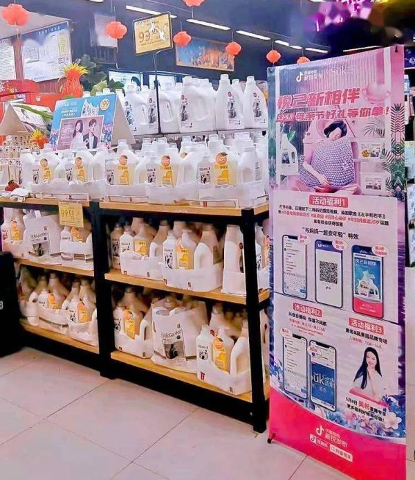 近百家商超中的蔬果园货架旁拉起了易拉宝展架,引导逛街的母子/母女顾客参与抖音挑战赛,来共享这场关于亲情的节日庆典。