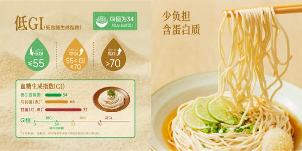 据了解,星期零此次推出的豆腐面通过专业、严格的GI测试,GI值为34,属于低GI食品。产品采用低脂配方,无糖、无麸质,每份豆腐面蛋白质含量达12g,约等于3.6杯纯牛奶的蛋白质含量。凭借低GI、低脂等特点,星期零低脂低GI豆腐面既能满足关注血糖反应的长辈、注重体重管理人群的饮食需求,也能为追求营养美味与便捷的上班族,以及重视全家健康饮食的家庭,提供更丰富、更友好、老少皆宜的饮食选择。