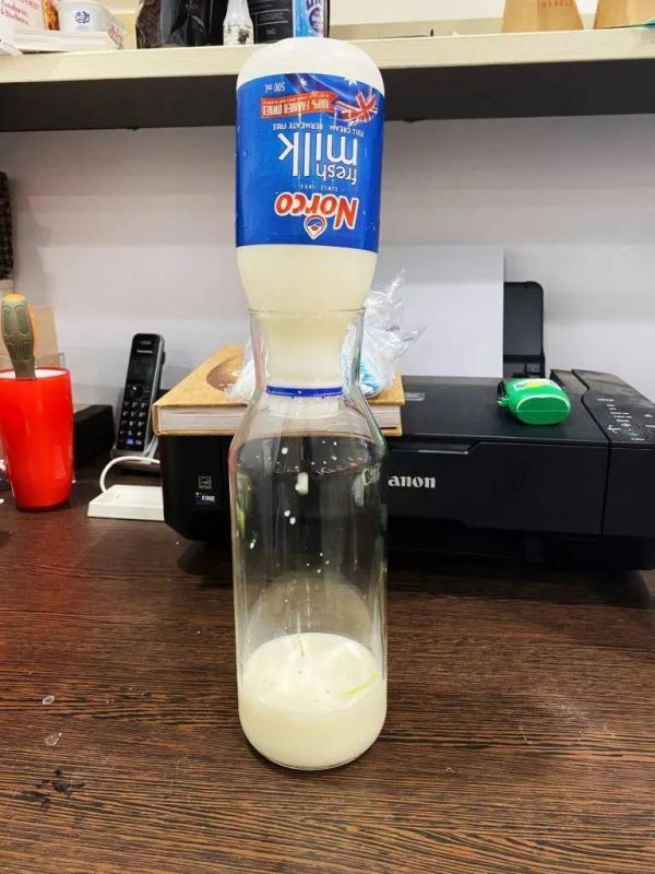 2、取出倒置,使其与水进行分离,得到浓缩牛奶。此过程可能需要几小时,这个阶段,需要进行观察,保证牛奶没有过度融化,防止水重新掺入。