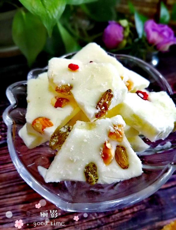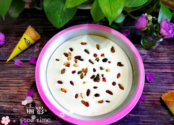 依据个人喜好,撒上适量的坚果、葡萄干或水果粒,这样口感会更加丰富哦!静待三五分钟,酸奶冰便大功告成。