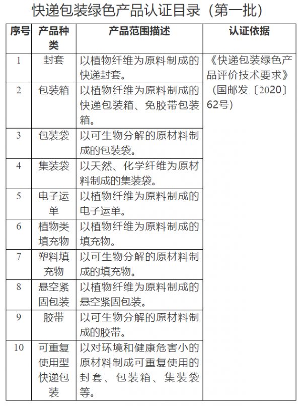 为推动快递包装行业绿色发展,根据《市场监管总局 国家邮政局关于开展快递包装绿色产品认证工作的实施意见》(国市监认证〔2020〕43号),现对《快递包装绿色产品认证目录(第一批)》《快递包装绿色产品认证规则》予以发布,自发布之日起实施。