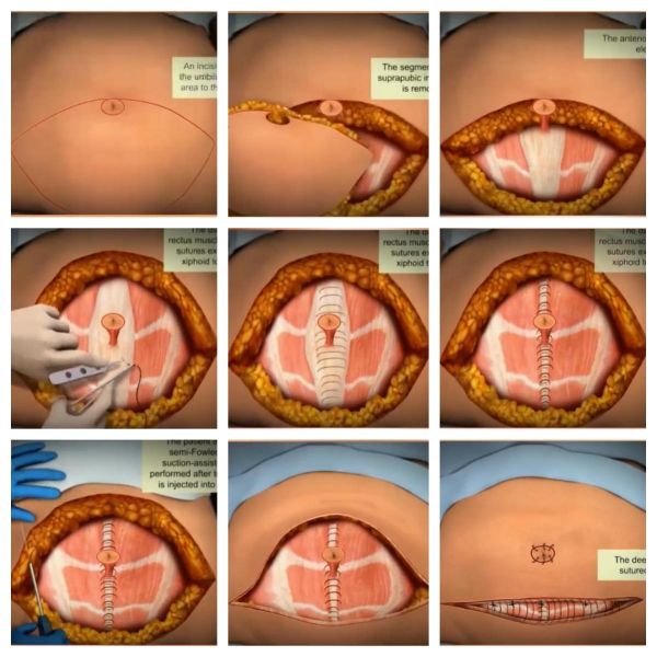 虽然剖腹产和腹壁成形术的切口相同,但两者情况不同,剖腹产是在宝妈无法通过顺产的方式完成分娩时选择的生产方式,剖腹手术是切开腹部的皮肤后,切开子宫,然后将胎儿取出来。所以剖腹产涉及腹壁部分,由外向内分别为皮肤、皮下脂肪、腹直肌前鞘、腹直肌、腹膜;子宫部分,由外向内分别为子宫浆膜层、子宫肌肉层和羊膜。