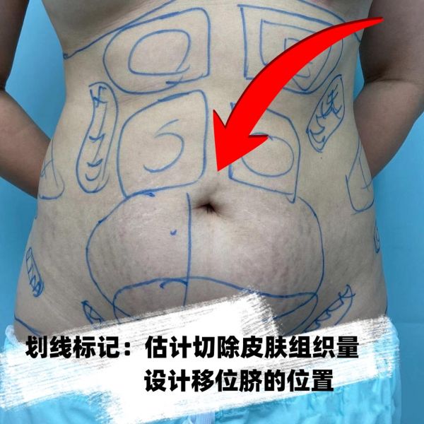 2. 手术难度大。腹壁成形术前我们会评估患者的身体基本情况、皮肤松弛程度,根据患者的需求进行精细地设计,并用龙胆紫将切口位置及需切除的软组织部分标记出来,以便术中精准地切除。