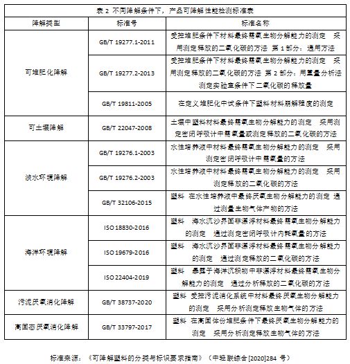 根据不同的降解类型,主要有以下几类检测标准,如表2所示: