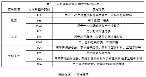 可降解塑料的应用领域十分广泛,具体主要运用在包装、农业及现代医疗领域,如表1所示: