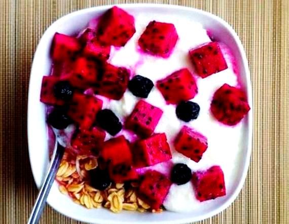 将红心火龙果切成小方块,再加入燕麦和果干,这样的搭配比单吃火龙果要过瘾得多。尤其是将这份酸奶放入冰箱冷藏之后,品尝时的酸甜口感与凉爽感觉更是让人陶醉。