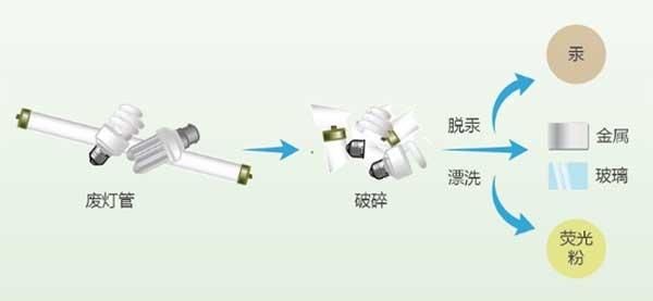 (1)废灯管处理:废灯管经过破碎后,碎片中的汞经过高温蒸发 再冷凝回收利用;荧光粉经化学处理后形成新的荧光粉,用于新荧光灯制造;分离后的玻璃和金属回收利用。