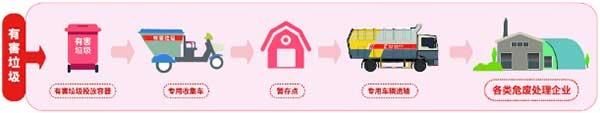 有害垃圾实行定期或预约收运。我们居民小区产生的有害垃圾投入到有害垃圾收集容器后,由所在区域生活垃圾清运单位或所在区绿化市容管理部门指定的具备条件的作业单位负责收运,通过专用的收集车将其运输到区级中转点存放,积存满一定量后,由区中转点管理单位(或区市场监管部门)预约市绿化市容局确定的专业收运企业进行统一运输、分拣贮存,最终根据危险废物类别交由有相应危废经营许可资质的单位进行无害化处置(如下图所示)。目前上海市各区都已经建设了有害垃圾集中分拣点。