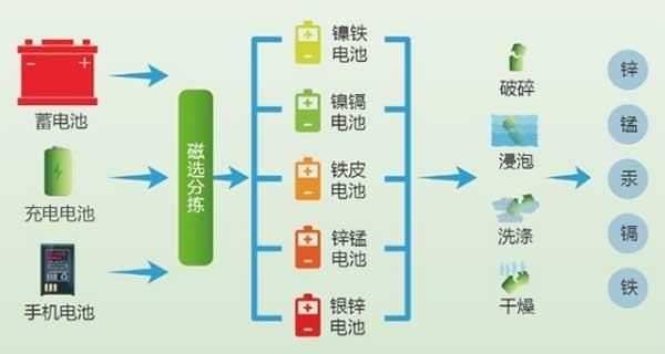 (2)废电池处理:废电池通过磁选进一步分为不同种类的电池。 依据电池的性质,采用破碎 、蒸发、干燥等物理、化学方法,将电池内的贵金属等成分提取出来,可以减少对环境的污染。