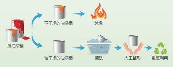 (4)废油漆桶处理 :装修后,剩下的油漆桶怎么处理?一般废油漆桶直接进行焚烧 处理,但为了资源化利用,较为干净的废油漆桶经过专业的清洗过程后, 返回到原单位再利用或用于复合固体粉末材料的包装。
