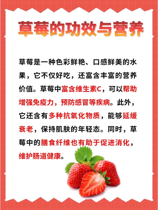草莓是一种色彩鲜艳、口感鲜美的水果,它不仅好吃,还富含丰富的营养价值。草莓中富含维生素C,可以帮助增强免疫力,预防感冒等疾病。此外,它还含有多种抗氧化物质,能够延缓衰老,保持肌肤的年轻态。同时,草莓中的膳食纤维也有助于促进消化,维护肠道健康。