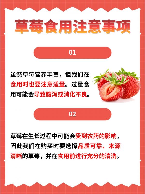 1、虽然草莓营养丰富,但我们在食用时也要注意适量。过量食用可能会导致腹泻或消化不良。