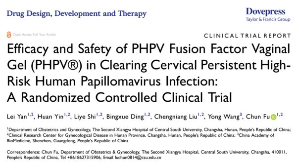 由福莱明生物联合中国科学院、华南理工大学共同研发的中国原研生物防御蛋白 PHPV 融合因子,及其器械凝胶制剂的关键临床研究成果(ChiCTR2200063608),近日发表于国际知名期刊《药物设计开发与治疗》(Drug Design, Development and Therapy)2026 年第 20 卷。该研究以高质量循证医学证据,证实了 PHPV 融合因子在清除持续性高危型人乳头瘤病毒(hrHPV)感染方面的良好疗效与优异安全性,为 HPV 感染的无创治疗提供了全新解决方案。