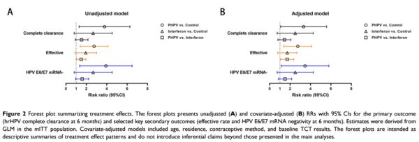 统计学分析显示,PHPV 凝胶器械组的 hrHPV 清除效果显著优于干扰素治疗组及无治疗对照组。其中,PHPV 组对比无治疗组的清除风险比(RR)达 2.81,差异具有统计学意义(P=0.005)。同时,PHPV 融合因子在降低病毒载量、抑制 HPV 癌基因 E6/E7 mRNA 表达等方面均展现出一致性优势,还显现出改善阴道微生态的潜在价值。