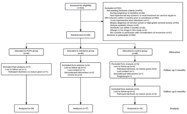 此次研究为随机对照临床试验,累计筛查842 例受试者,最终 120 例持续性 hrHPV 感染患者符合入组标准。受试者经随机分组后接受为期 3 个月的干预,并完成 3-6 个月的随访观察。