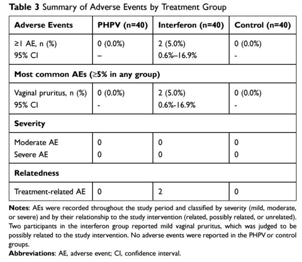 PHPV 凝胶在临床研究中展现出优异的安全性特征,成为本次研究的一大亮点。在整个研究周期内,PHPV 组未报告任何不良事件,而干扰素组有受试者出现阴道瘙痒的不良反应。