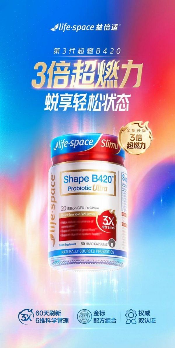 lifespace益倍适与全球健康营养巨头IFF达成独家战略合作,成为IFF B420益生菌全球首家战略合作伙伴,搭载IFF全球独家金标配方,是双方共研共创的核心成果。该配方甄选6大明星菌株协同作用,实现3倍菌株协同效果,深度激活人体线粒体“小火炉”燃脂开关——线粒体作为人体能量代谢的核心,其功能强弱直接决定燃脂效率,这款配方可让代谢效率实现3倍增速,同时覆盖体重、体脂、腰围等6大身体维度的改善,相较于前代产品实现质的提升。其中,3倍轻盈力与3倍清排力双向加持,全方位为代谢赋能,精准匹配代谢慢人群的核心需求:
