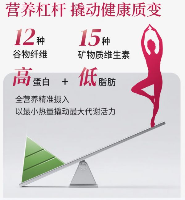 尽管热量低,但产品的营养密度极高,富含10.89g优质蛋白,助力肌肉合成与修复,避免肌肉流失;同时含有15种维生素矿物质,涵盖维生素A、B族、C、D、E以及铁、锌、钙、钾等多种人体必需的营养素,精准填补减脂期易出现的营养缺口;此外,还添加了12种谷物膳食纤维和24种8大类关键营养素,全面覆盖人体减脂期间的营养需求,彻底杜绝节食减脂引发的各种健康隐患,是真正适合大基数人群长期服用的健康减脂产品。