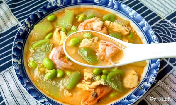 推荐食谱一:冬瓜毛豆菌菇鸡蛋汤