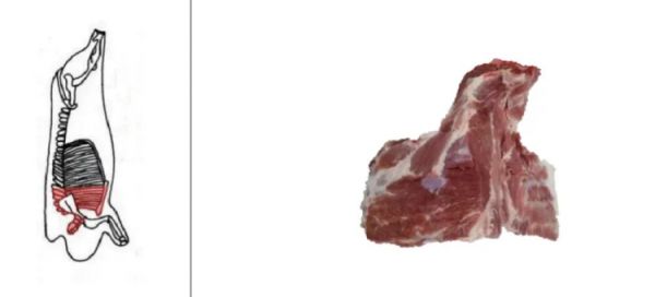 取自猪第五、第六椎间至颈椎部位脊骨,去除颈背肌肉,带胸骨和五根肋骨的部位肉。猪小排则是猪前排有肋骨部位,带肋骨5根~6根,去脊椎,硬胸骨,呈A字形的部位肉。猪前排往往会带一点软骨、筋膜和更复杂的骨边结构,肉不算厚,但口感很丰富,既有肉香,也有软骨的脆嫩。