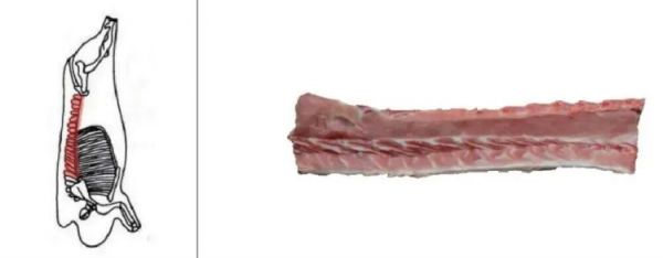 猪脊骨也叫猪龙骨、猪腔骨,自猪的第五、第六胸椎间至腰椎第四处锯断,并取出背最长肌,表面肉色呈鲜红色的骨头。骨头占比较高,肉相对少,肉质口感偏紧实,也就是常说的有点柴。