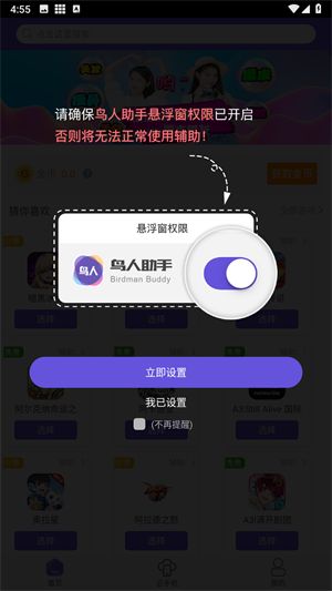 3、“鸟人助手”手游辅助软件运行中如果“浮窗”没有出现可使用"+”和”-”按键来启动和停止。需要显示浮窗可在手机”设置-应用”中查找鸟人助手选择显示浮窗。