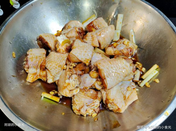 第一步:准备鸡中翅七八个左右,用清水浸泡一个小时左右再清洗干净,而后将其从中间剁开成两半放入盆中,加入一些食盐、生抽、蚝油、料酒、葱蒜等抓匀腌制半个小时左右待用。