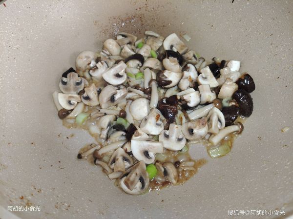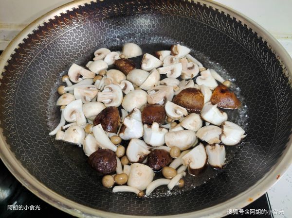 第四步:此时锅里还剩了一些食用油,不够的可以再添加一些。继续加热后倒入葱姜蒜炒出香味,而后把焯水后的各种蘑菇倒入锅中,转为大火快速地翻炒,炒去一些水分后激发出食材的鲜香味。