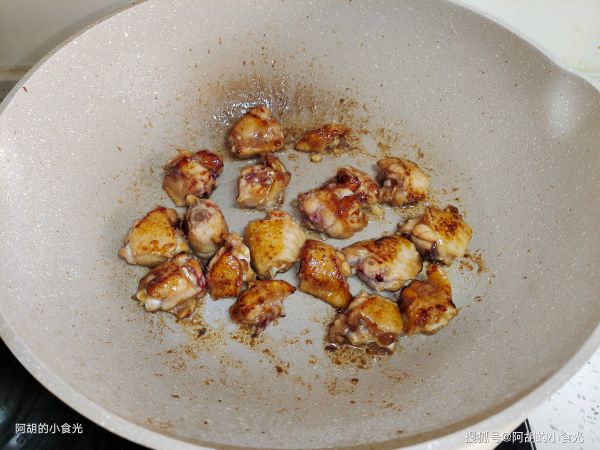 第五步:把第三步中煎好的鸡翅回入锅中,先大火炒匀,而后淋入一些生抽、少许老抽、蚝油等调味料炒匀炒出香味。