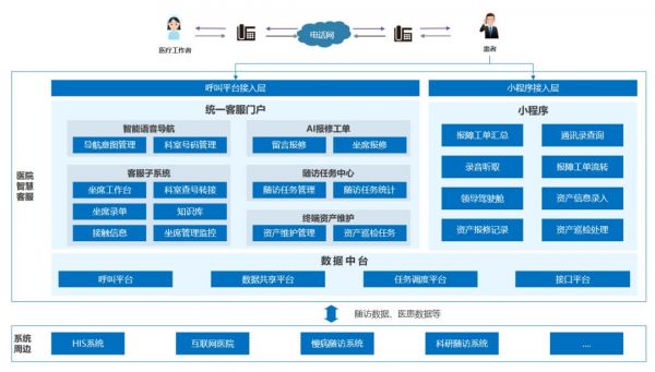 安徽省立医院智慧客服系统基于SDCC技术实现了 IVR 自助服务与热线人工服务,通过统一客服门户完成工单、随访管理、终端资产维护、全院科室通讯录等核心功能模块的深度融合。在数据交互层面,系统通过数据中台实现HIS、慢性病随访等周边业务系统能力的对接,构建了一站式、前后端能力拉通的智慧客服体系。