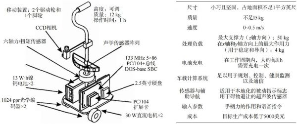 基于运动信号的感知是最早应用于智能助行器上的感知方式,也是使用最广泛、最可靠的感知方式。通常采用布置在助行器上的多轴力传感器、惯性测量单元(IMU)、加速度计等传感器采集使用者的肢体动作及助行器的运动角度、速度、位置、受力等信号,从而判断使用者及助行器的运动趋势和状态。PAMM是2000年由麻省理工学院团队研制的一款用于个人移动和监控的辅助设备,是最早的智能助行器之一,构型及主要参数见图1。