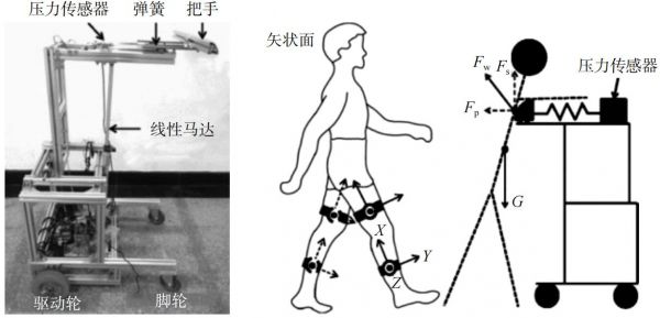 为进一步提高人机交互的平滑性,使用户使用助行器时更加自然,研究人员对此做出了不懈努力。如2018年Wang等开发了一种结合可穿戴设备和固定式测量传感器的助行系统(图3)。该设计试图通过机械结构减少人机交互界面的刚性冲击,增强人机交互的自然性和舒适性。