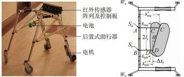 在助行器上使用传统的机器视觉传感器已发展多年,Wasson等设计的智能助行机器人MARC Robotic Walker可根据声呐、红外传感器等信息结合用户的命令来推测用户的行走意图,是最早采用视觉信号预测行走意图的助行器之一。Moreira团队于2019年研制了ASBgo助行器,其底部布置了深度相机和激光测距传感器,可获取脚位置和方向的信息,用于步态分析与监测,还额外使用了红外传感器检测用户摔倒风险。类似的还有哥伦比亚Sierra团队设计的AGoRA智能助行器(图4),搭载了红外传感器、相机和激光雷达,用于检测追踪使用者。Ragaja等研制了一种后路主动助行器,如图5 所示,通过后置与用户骨盆高度齐平的红外传感器阵列检测人体躯干与前进方向的夹角,从而识别使用者的迈步动作与转向动作。